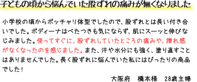 少しでも興味があったら、はいてみたいスカートがあるなら、ポディーナを申し込んで欲しいと思います。そして股ずれの痛みから解放されて、おしゃれをして街に出かけてください。