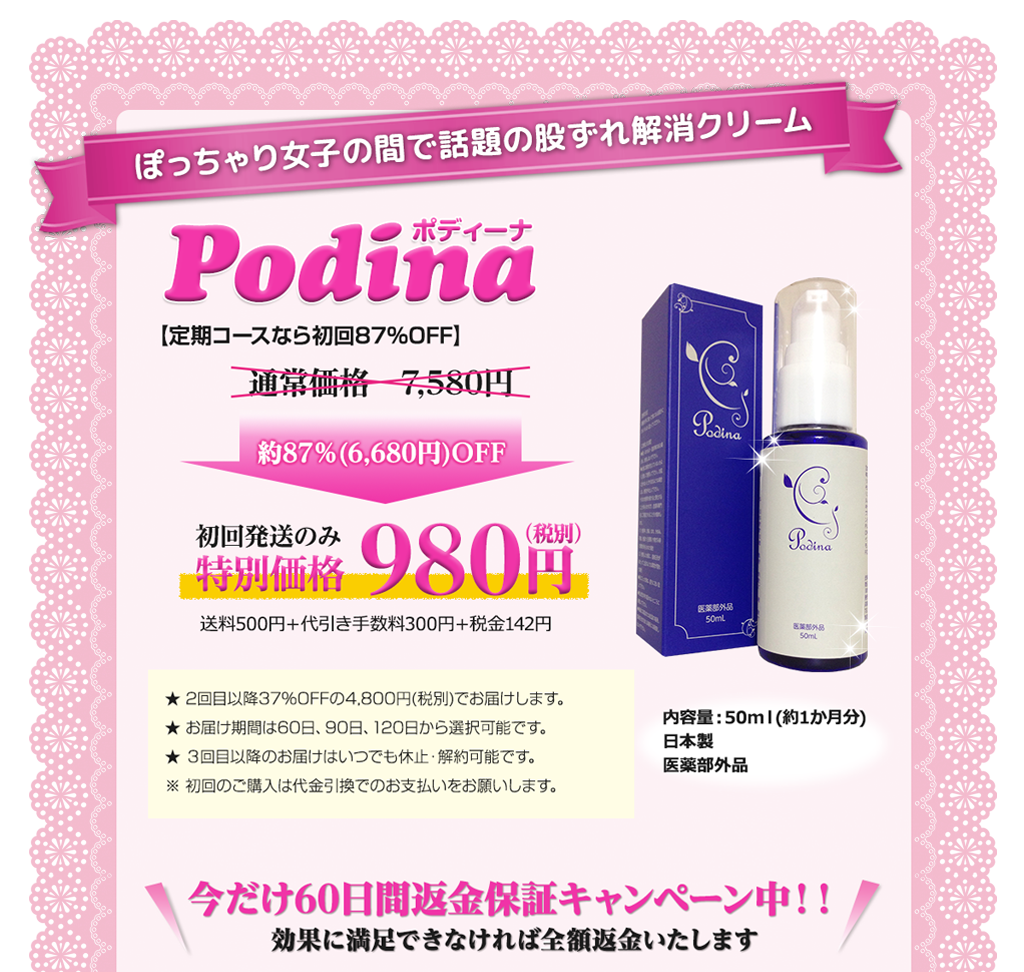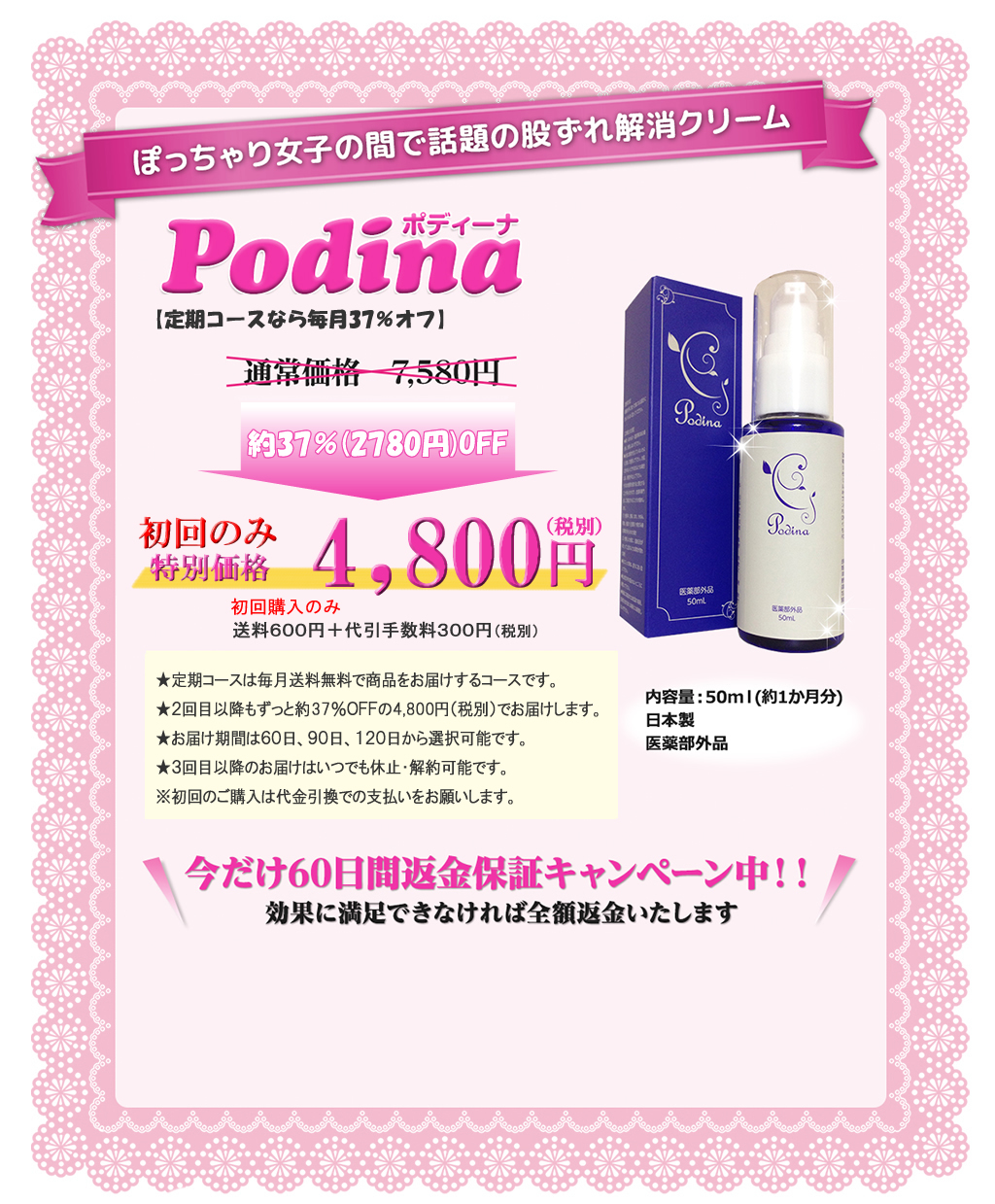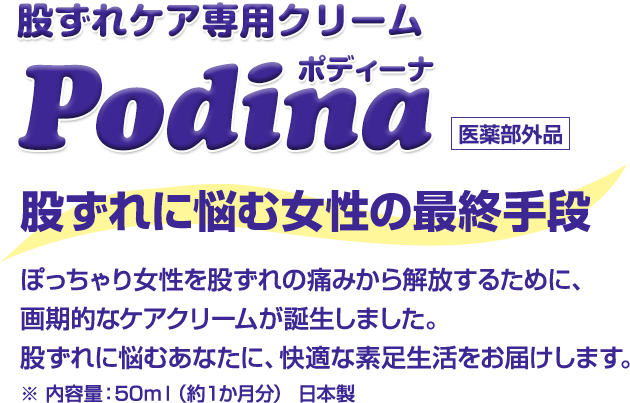 股ずれにお悩みの方は一度、ポディーナを実際にお使いください。「効果を実感できなかった」「肌にあわなかった」など、返金を希望される場合、その旨をご連絡いただきましたら、すぐに返金の手続きを取ります。その際 今後の製品開発のために返品理由をお聞きすることがありますが、 どのような理由でも返金をお断りすることはありません。