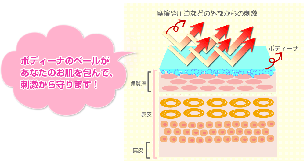 ポディーナは塗ると5分で膜を形成し、サラサラの触り心地に変化するので、べたつかず、快適な使い心地です。