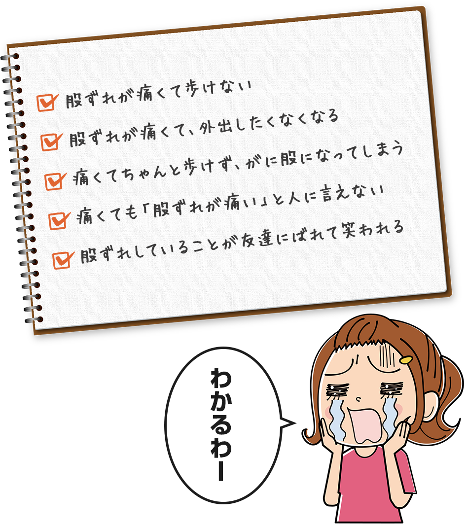 友達と遊びに行っても、すぐに股ずれになってしまって・・・痛くて歩くのも辛いのですが、「股ずれが痛くて歩けない」なんて、恥ずかしくて誰にも言えません。顔は笑っていましたが、当時は本当に、情けない気持ちでいっぱいでした。
