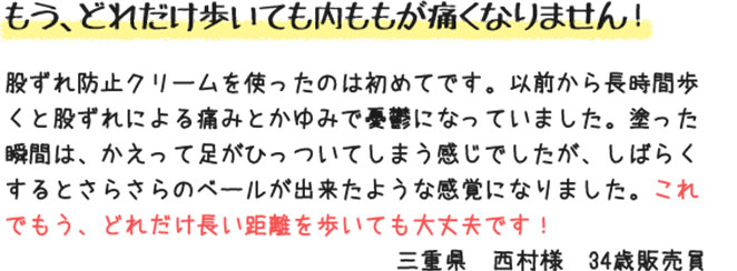 以前から股ずれの痛みに悩んでいました。スカートをはくと太ももの内側が擦れて、本当に痛いんです。特に、汗ばむ季節はひどくて。これは経験したことがある人にしかわからない辛さですね。