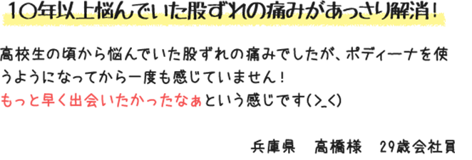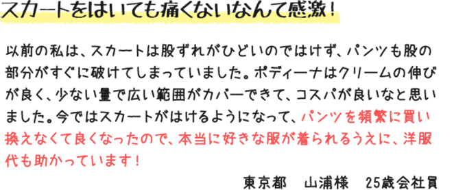 少しでも興味があったら、はいてみたいスカートがあるなら、ポディーナを申し込んで欲しいと思います。そして股ずれの痛みから解放されて、おしゃれをして街に出かけてください。