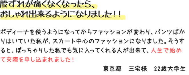 彼と会う時はいつもかわいいスカートをはきたいから、もうポディーナは欠かせません!股ずれに悩んでいる女の子には、絶対にポディーナをおすすめします。